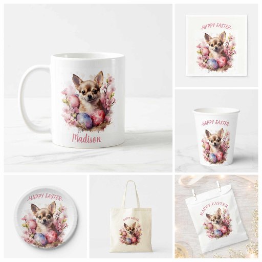 花と復活祭の卵を持つチワワをフィーチャーしたマグカップ。カスタマイズ。