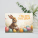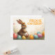 かわいいイースターバニーが花冠をかぶって、色とりどりのイースターエッグに囲まれて愛らしく座っています。彼の足には、ペイントされた卵の入った小さな柳の籠を持っています。このシーンは、繊細な春の花と温かい光に囲まれています。ウサギの上には、陽気なオレンジ色の「ハッピーホリデー」という文字が輝いており、春の祭りの軽やかさと喜びを捉えた、心からの挨