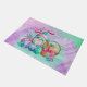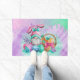 イースターバニーの格言で飾、ピンクのバニーの耳が卵と、春の花に座ってニンジンの籐の籐のバスケットが水彩ティール(緑がかった色)とパステルキャンディのアイシングドリップと紫の格子柄の背景に設定。