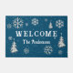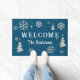 青と白のエレガント冬の休日パーソナライズされた「ようこそ」家族のドアマットテンプレートは、松の木と雪の結晶とグリッターで覆われた(これらはデジタル効果で、石やグリッターではなく!)パターンと輝く冬の背景を含む。家族の名前でパーソナライズする。