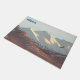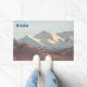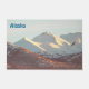 ハゲのワシが、アンカレッジ近郊の雪に覆われたChugach Rangeの前を飛ぶ。カスタマイズ読可能な文字の「アラスカ」も表示される。