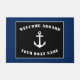 "ようこそ船"とあなたのボート名または他の希望の文字と素敵なDoormatカスタム、黒と海軍の青の背景に白のクラシックのいかりを設計縁どした。現在の色やテーマに合わせて簡単にカスタマイズ可能。