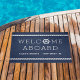 船に乗って歓迎する客を迎えるカッコいい際は、白いレタリングで「O」の代わりに船の車輪が付いた「歓迎の船」の形式を使用する。 下の船の名前と船のレジストリでパーソナライズし、クラシックのネイビーブルーの背景に白いロープトリムでアクセント。