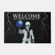 ハロウィーンの歓迎の文字"ようこそ、私たちはあなたを期待していた。デザインはレトロな白いディスコのスーツに踊りの骨格をフィーチャーし、ディスコのボールは稲妻のボルトで帯電。年間の家族のパーティーを歓迎するのに理想的。