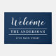 そしてタイムレスなエレガント通り形式の機能は書の台本で書は「ようこそ」あなたの家族の姓と白いのアドレスとのアクセントとシンプルのカスタムを持つ。注:ネイビーブルーの背景と白い文字の色は、あなたのポーチやエントリデコールと調整するように変更することができる。