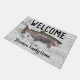 「Your Family Name」ホームへようこそ、またはコテージに変更。魚釣りをテーマにした歓迎マットは、魚を愛する家族のための。このデザインはニジマスと素朴な背景を備えている。