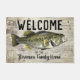 「Your Family Name」ホームへようこそ、またはコテージに変更。魚釣りをテーマにした歓迎マットは、魚を愛する家族のための。このデザインはランカーの大きなベースを備えている。