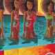 おもしろいユニークレトロスタイル壁日没時にビキニを着てビーチにアフロ髪スタイルを持つ2人の女性を表す。絵を描定評のある芸術家だ生素晴らしきている宇宙、イベント宇宙、ショップに加えて!目を引く鮮やかと。