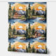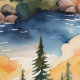 水彩小屋は、毛松の木々、のクリーク、山走々、日没の壁紙と森林林の中。
