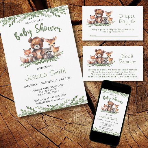 ウッドランド動物水彩赤ちゃんシャワー 招待状