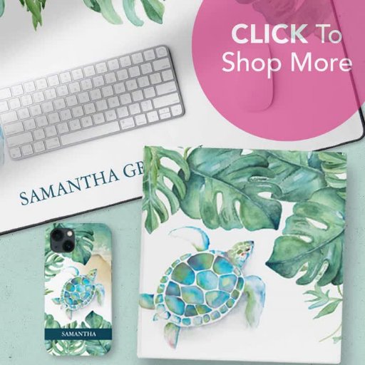 水色のウミガメとモンステラ葉パームターコイズブルーとグリーンの色合いを特徴とするトロピカルデスクマット。ネイビーブルーで自分の名前でパーソナライズ。ホーム魅力的またはオフィスのデスクトップ用のアイディア。新学期や寮の客室にも最適。アートワークとデザインby Victoria Grigaliunas.よりカスタマイズ可能な熱帯のデスクマットを参照するには、www.zazzle.com/dotellabelle