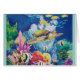絹絵画の青いウミガメと友人。小さな金ゴールドの魚、天使の魚や他のカラフルの海藻やサンゴで海の共有。おもしろいと明るい水族館、ギフトショップ、ギフトやカード。