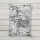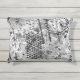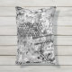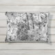 この装飾用クッションは、ゼブラストライプの円を含む折衷的抽象芸術を特徴とする。色は灰色(または灰色)から炭から黒まで多岐にわたる。