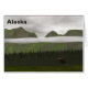 非常に灰色絵画で曇った日にアラスカの緑の針葉樹と山のデジタルの写真。フォアグラウンドのブルムースがシーンに合わせてスケールする。文字読の「アラスカ」も登場する。