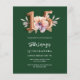 クイモダンンセースタイリッシュニェラへの魅力的な招待。ピンクと桃の飾水色の花を持つエメラルドグリーンの背景。名前は緑色の手書に文字の付いたスタイルのスクリプモダントで示されている。カスタマイズしてパーティー詳細を追加する。15番はバ書ロンスタイルフォント、スクリプト。1枚= 1枚の招待状を印刷したエッジからエッジ