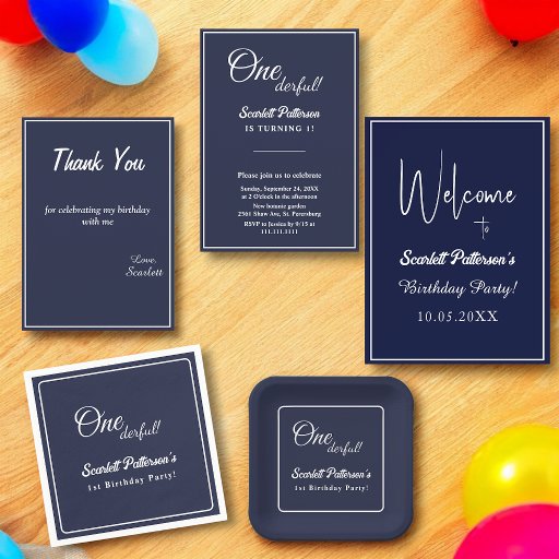 エレガントなネイビーブルーとホワイトのミニマル1歳誕生日 招待状