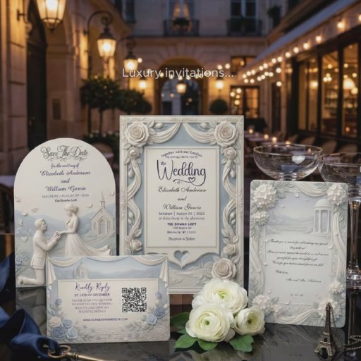 伝統的なスレートとクリームのデザインで、美しく印刷された彫刻された花の情景を特徴とすることで、特別な日の歴史的でロマンチックな雰囲気を演出してください。