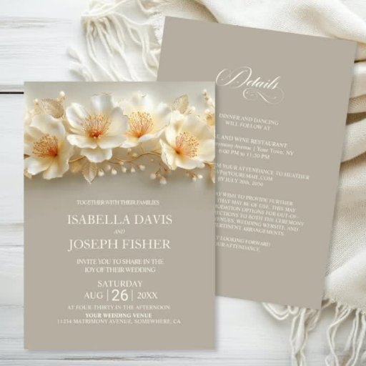 このエレガントなホワイトとゴールドの花柄の結婚式の招待状で、友人や愛する人たちをあなたの結婚式に招待しましょう。カスタマイズ可能なテキストを使用すると、新婦と新郎の名前、結婚式の日付、祝賀会の必要な詳細を簡単に追加できます。独自の招待状に最適な紙の種類やコーナースタイルが多数用意されており、デジタル形式を好む場合はダウンロードオプションもあります。