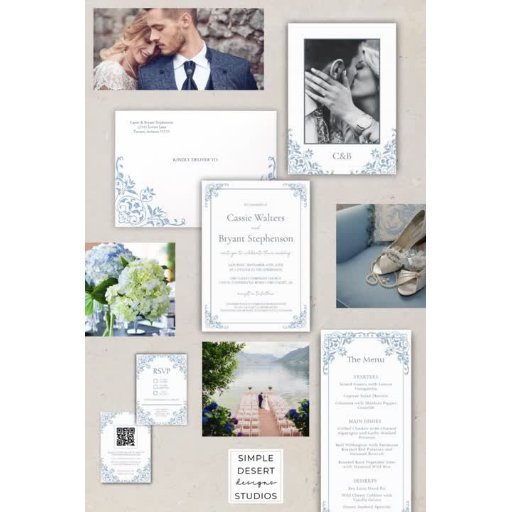 この美しいライトブルーのテーマの結婚式リハーサルディナー招待状で、結婚式のリハーサル夜の舞台を設定してください。 青と白の色合いは、沿岸の chic、ロマンチックなオールドマネーのヴィンテージ結婚式やフラワーのガーデン結婚式に最適です。 詳細をパーソナライズし、裏面に新婦と新郎のモノグラムを追加してください。 Simple Desert Designs Studioによって設計されました。 結婚式のテーマに合ったカスタマイズされた色についてはメッセージをお送りください。