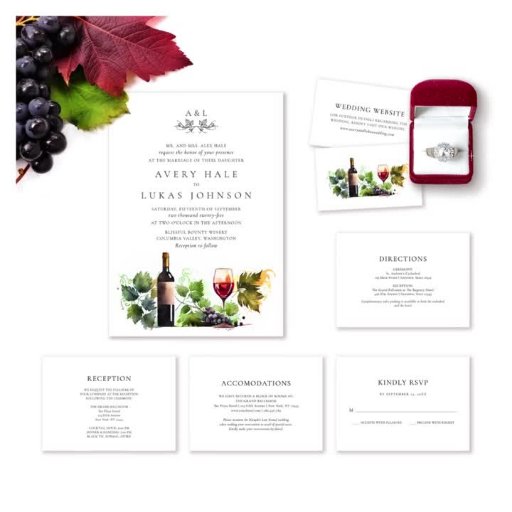 エレガントな結婚式のモノグラム ウォーターカラー ワイナリー 招待状