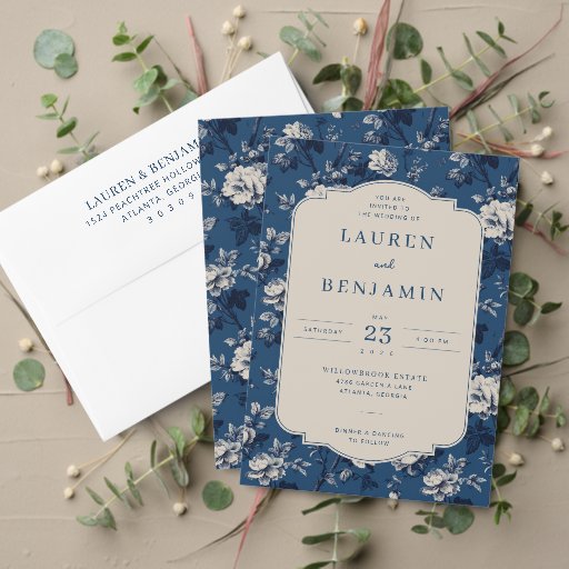 これは、青と白の色調を特徴とするヴィンテージスタイルの画像で、繊細なバラと葉の茂みがあしらわれた背景が、洗練されたタイムレスな外観を生み出しています。中央には、クリーム色の円形のスペースに「L | B」のイニシャルと、2026年5月23日の心からの「ありがとう」のメッセージが表示され、感謝と洗練の感覚を醸し出し、結婚式や特別なイベントでの感謝の気持ちを表すのに最適です。