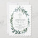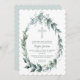 このモダンな誕生会招待状は、青い十字架とエレガントな水彩画のセージグリーンの葉と銀灰色の花の芽のリースを特徴としています。当店の他の商品と合わせることができます。