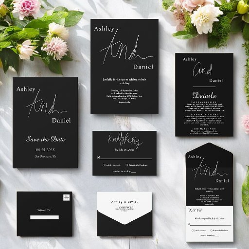 このエレガント白黒の結婚式招待状はAのシンプルためのピッモダントです結婚が、黒い背景に白い書エレガント跡を持つデザインである。