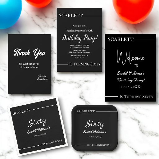 このエレガント白黒誕生日の招待は誕生日に最適でモダンすシンプル。黒い背景に白い書お洒落跡を取り入れたデザイン。