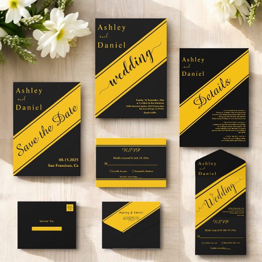 このエレガント黒と金ゴールドの結婚式招待状はモダンの結婚ための完璧なシンプルデザインは黒い背景に金ゴールド書を備えている。