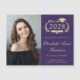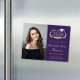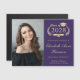 パープル大学フォーマル卒業発表磁気カード卒業生の学年、ローレルリースのイラストレーション、グラードキャップトッパー、卒業生の写真、金ゴールドスクリプトに彼らの名前を含むエレガント。学校、名誉専攻のまたは将来の計画をクラシック金ゴールドセリフタイポグラフィに追加する。