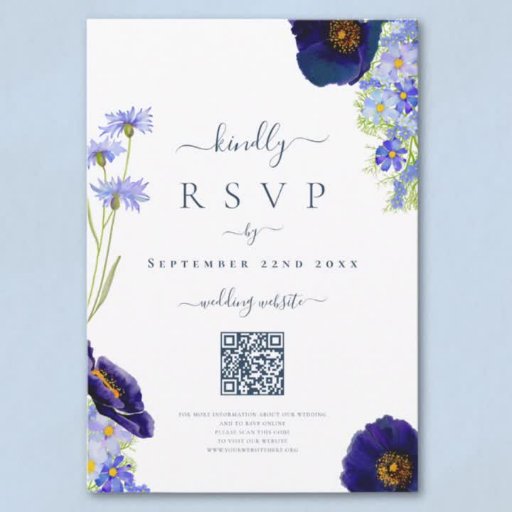 夏のエレガントフローラ水色ワイルドフラワーブルーの結婚式rsvpの応答カードと春や夏の完璧な結婚カード。美しいロマンチックエレガントなタイポグラフィスクリプトで結婚は、テンプレートを使用する簡単を使用して回答日と出席情報でパーソナライズする。とうもろこユニークの花、ケピー、コスモスと私の鼻を含む牧草地の野花忘れと絵を描、繊細な葉の手と私の鼻とうもろこし青、ほこりっぽい青、赤面青、ネイビーブルー、紫と緑の色合いのアーティストのCatherine Sweetmanによる。植物園や屋外春、夏に最適結婚。夏のフローラブルーのスイートエレガントで一致する項目を結婚検索