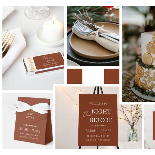 白エレガントフォントとテラコッタの夜リハーサル前ディナー結婚式招待状