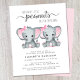 柔らかい灰色のフレンドリータイポグラフィとスクリプトと2つのパステルピンクの水色のベビーゾウの書2つのパステルピンクの水の色でモダンは「2つの甘い小さなピーナッツが彼らの道にある」とキュートで予算の双子の赤ん坊の女の子のシャワーの招待。母親の名前とシャワー詳細でパーソナライズされた灰色のタイポグラフィシンプル。