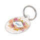 桃と白い模様のペットのラベルストライプの。上に重ねられたオレンジ色とピンク色のフローラアレンジメントは緑離れの。ダイヤモンドの形をしたフレームが上に重ねられ、文字が内側にパーソナライズされたある。