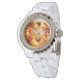 まぶしいオレンジ色のシトリンのイメージと女性のライン石の白いエナメルウォッチ。一致するラウンドボタン、ラウンドチャーム、ドロップイヤリング、旋回メタルのキーチェーンとラウンドネックレスを参照。ACCESSORIESセクションのGemstones & Medallions Watchコレクション全体を参照。
