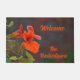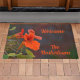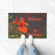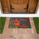 美しい写真のオレンジと緑のフローラ柔らかくミュートされた背景に対して明るいオレンジのナスタティウムを特徴とする歓迎自然のdoormat。すべての文字は、自分の挨拶と家族の名前のためにカスタマイズ可能。