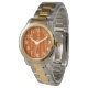 このメンズウォッチは、茶色のフィールドにモダンオレンジ色のの垂直の2つの色合いで丸い長方形の半ランニング世紀のデザインを持っている。女性の時計も利用可能。