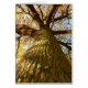 大きな曲がった幹と枝を見上げ、青い空を背景に黄色い葉の冠を写真のカード