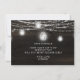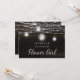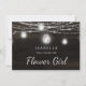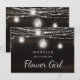 オークリッジ ラスティック ダークブラウンの納屋の木材、きらきらとしたメイソンジャー、輝くストリングライトのデザイン。深い豊かな木目テクスチャにツインクリングする光のストランドと瓶がぶら下がっています。白いアクセントとモダンなタイポグラフィのスクリプトフォント。 ラスティックでエレガントなカントリー ファームハウス スタイルのデザイン - パーソナライズされたウェディング フラワーガールにいてくれますか? 提案カード!