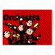 ミュージシャンの"オーケストラ"のグループの後ろの同心円の薄く黒い輪郭が付いている赤い背景遊ぶことおよび上記の単語。