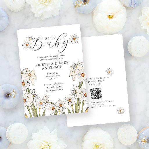 晴れた春のダッフルズで「こんにちはベビー」と言うヴィンテージダッフルズのデザインを特徴とするオールインワンの赤ちゃんシャワー招待状 | narcissusフレーミング慎重に選択された文字。裏面にはベビーシャワー詳細と母子登録のためのQRコードが備えられている。この甘いデザイン。