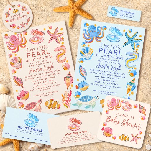 オceanパール 海の生き物 ピンクの女の子 ベビーシャワー 招待状