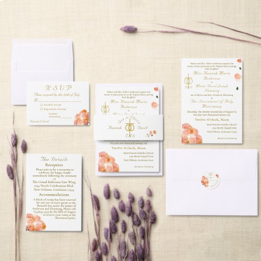 デザインは、白い背景で囲まれたメイン画像として提供する写真を特徴とする。2つの繊細なバラのイメージが底の角を離れ固める。テキストは金ゴールド色のNuptialフォントで表示される。「テラコッタバラカトリックのスイート」と結婚連携するように設計。 そこエレガント。