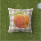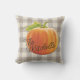農家の国スタイル秋のベージュブラウンとオフ白のギンガムプレイドパターン、明るいオレンジ色のカボチャを上に。お好みの家族カスタマイズ名または(制限された)文字でパーソナライズまたはパーソナライズするオプションで。おもしろいの暖かい秋色の屋外クッションあなたのパティオやキャビンのポーチを飾り、秋シーズン、感謝祭の休日とハロウィーンの気分を得る。