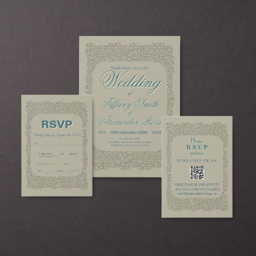 軽い茶色の背景に茶色のレースのフレームを付けエレガントてユニーク、明るい影を付けた青い文字を持つ洗練さカスタムれたヴィンテージの結婚式の招待で、あなたのニーズに応えカスタマイズる。セレモニーの優雅さと洗練さを強調するために設計された、カップルとその家族。