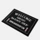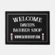赤カスタムと青の理容師ポール記号と理容師ショップdoormat。自分のビジネス/会社名でパーソナライズ。白黒ドアマット。