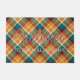 美しいコンテンポラリーティール(緑がかった色)ブルーグリーン、ダークマルーン赤、暖かいカボチャのオレンジとアイボリーオフ白の色の格子状のタータンチェックパターン。お好みのカスタマイズ家族の名前または(制限された)文字でパーソナライズする余地がある。