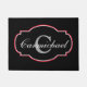 玄関のカスタムのデザインで、モノグラムと姓の両方を備えた歓迎マットは、黒の装飾フレームに囲まれた赤いアクセント付き。デザインテンプレートに表示されるサンプル文字の代わりに、名前とイニシャルを挿入する。フォントを変更するには、「カスタマイズit」ボタンを選択する。