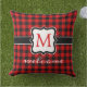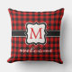 おもしろいの屋外装飾用クッションコンテンポラリーと黒と赤のプラ市松模様にイドのパターン。スタイリッシュ素朴なユニークデザインと部屋を持つあなたの家族の名前モノグラムでカスタマイズパーソナライズ。オリジナルのパーソナライズされた屋外デコーモノグラムのルアクセント飾は、あなたの国のコテージの家、素朴なログキャビン、山のロッジ、魚釣りキャンプ、湖や川のバケーションホームのフロントポーチロッキングチェアやヤード。