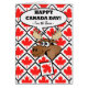 このカおもしろいナダデーのグリーティングカードのカバーのカエデの葉のタイルの壁を破るムース。ハッピーカナダデー!カバーのボス文字用。赤はっきりしたコンテンポラリー、白、黒、茶色のデザイン。